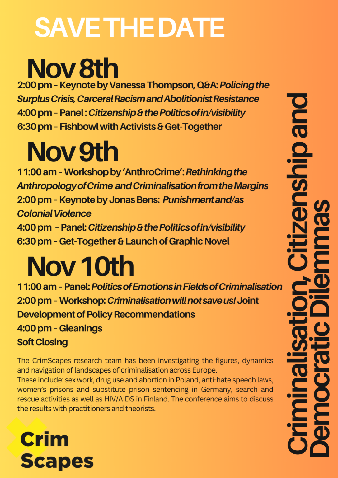 The “CrimScapes” Research Team is thrilled to invite you to a three-day conference in Berlin on Criminalisation, Citizenship and Democratic Dilemmas, running from Nov 8th @ 2 pm until Nov 10th @ 5 pm.