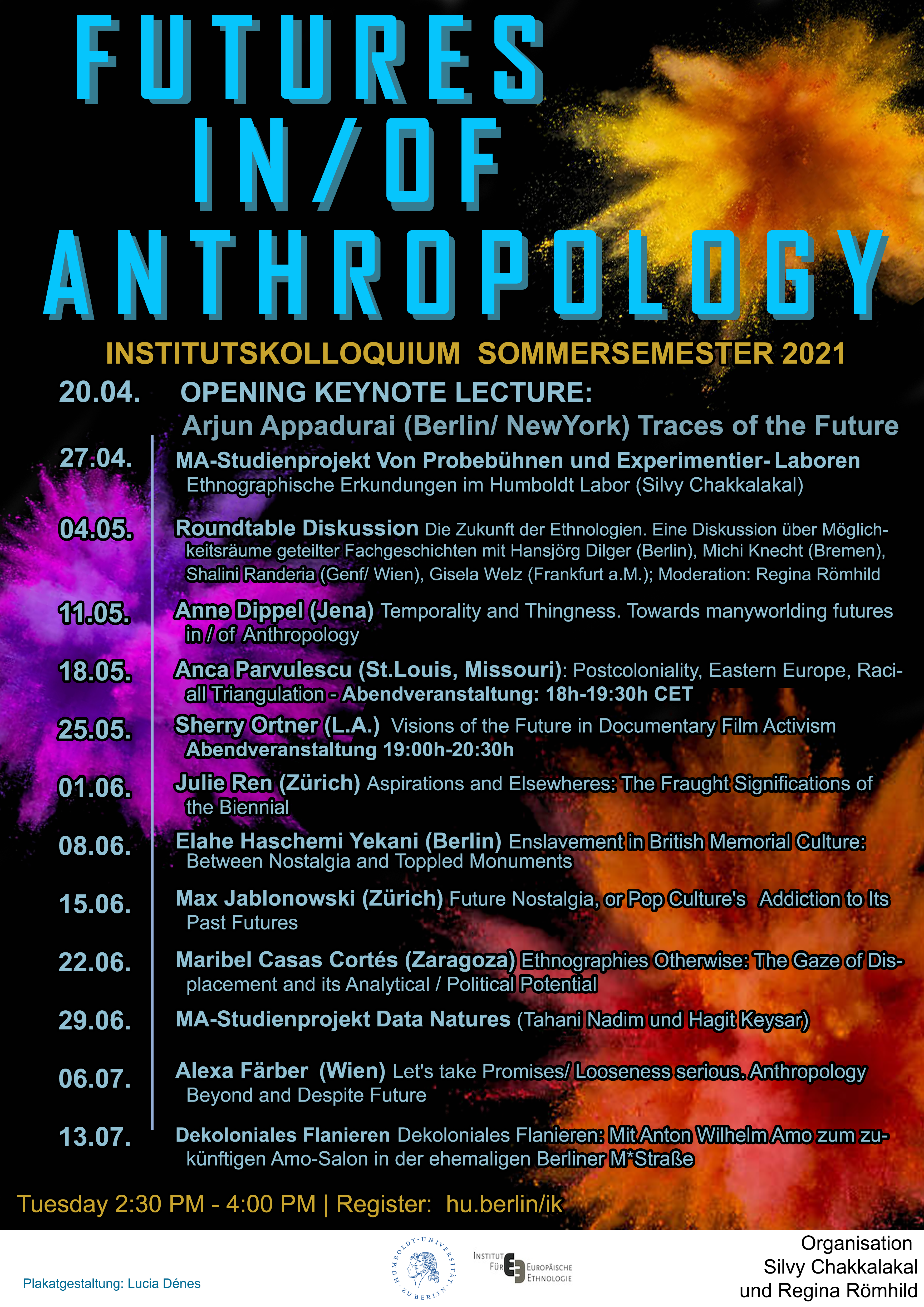 Questions of this kind will be addressed from an international set of speakers. Lectures will be commented by local discussants. We hope for a stimulating discussion on anthropology as a public discipline that is simultaneously engaged in questioning normative powers of the future as well as in critical future making.