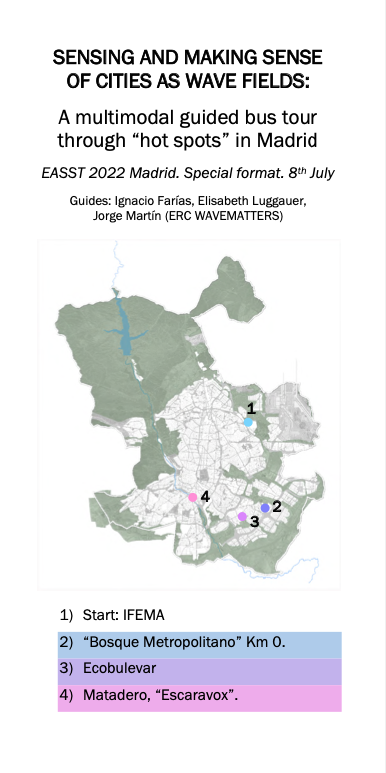 On the 8th of July 2022, more than 50 STS scholars attending the EASST conference in Madrid participated in a three-hour “thermodynamic” bus ride organised by the WAVEMATTERS team to selected “hot-spots” and heat infrastructures in Madrid. In our experimental journey, we visited three thought-provoking sites – the Bosque Metropolitano, the Eco-Bulevar, and the Escaravox – that stand for different types of urban heat infrastructures. At these places, we sensed heat with our bodies in perceptual walks, while in smaller groups, we reflected on our heat experiences, sensations, and strategies. And finally, aiming to make sense of heat, of bodily exposure to heat, and of cooling infrastructures, we gathered under some trees in a park next to Matadero, our last stop, for a closing round of discussion and reflection. In groups, we reflected on the visited sites with two questions in mind: What kind of practices and users do these sites invite or exclude? How do these sites infrastructure futures and which futures are those? We learned how each of the three sites is embedded in local urban textures, reflected upon the gaps between the visions and aims of planners and designers and the actual modes of appropriation, as well as on how heat is imagined in each of these sites, and on which heat futures, or future heat practices, are enacted in each of these interventions.